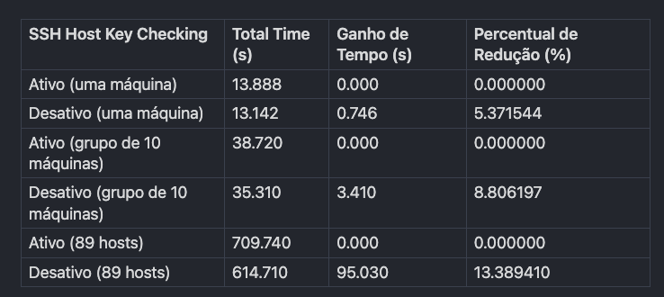 O impacto da desativação do SSH host key checking cresce com o aumento do número de máquinas. Enquanto o ganho é modesto para poucas máquinas, ele se torna bastante significativo para grandes grupos, chegando a até 13.38% de ganho com a desativação.