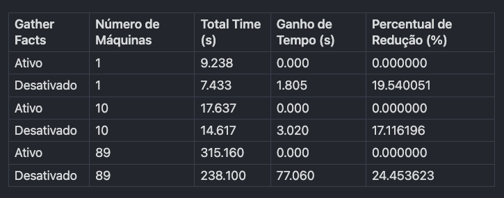 Os resultados indicam que, ao desabilitar o gather_facts, a redução no tempo de execução é proporcionalmente mais significativa com o aumento do número de máquinas. Embora o tempo economizado seja menor em termos absolutos para um pequeno número de máquinas, ele se torna substancialmente mais relevante em ambientes maiores, onde a coleta de facts em cada host pode se tornar um gargalo.